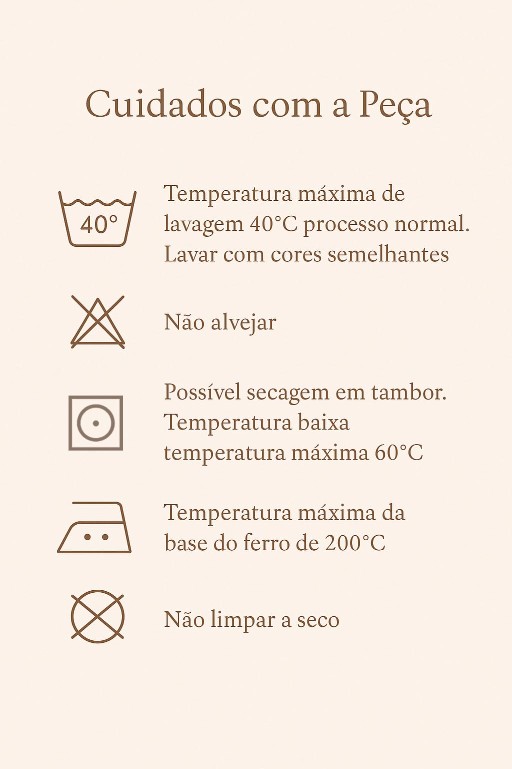 Algodão e poliéster (tecido confortável, com toque natural e fácil de cuidar)